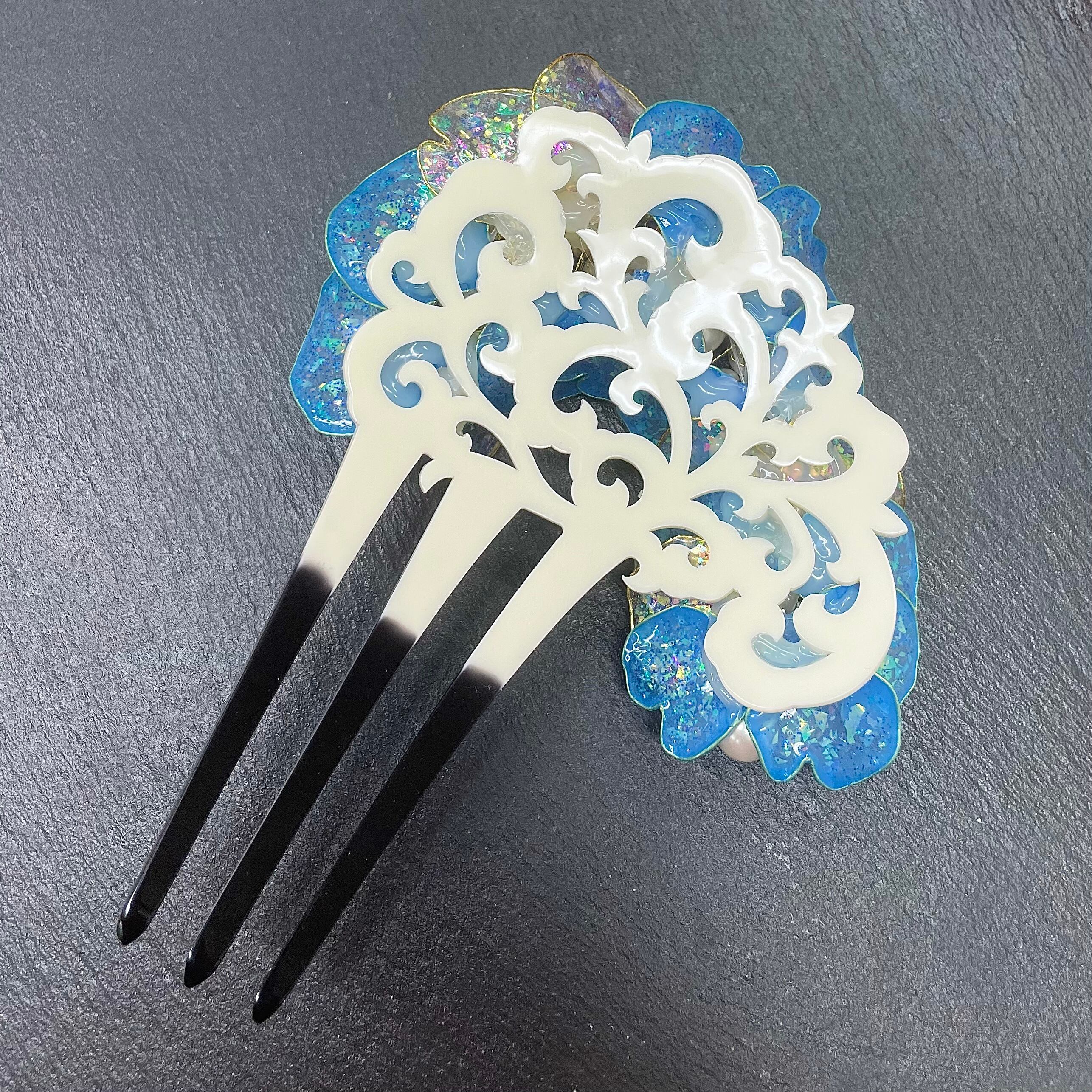 小ぶりバチ型かんざし 青系(白透かし) 070